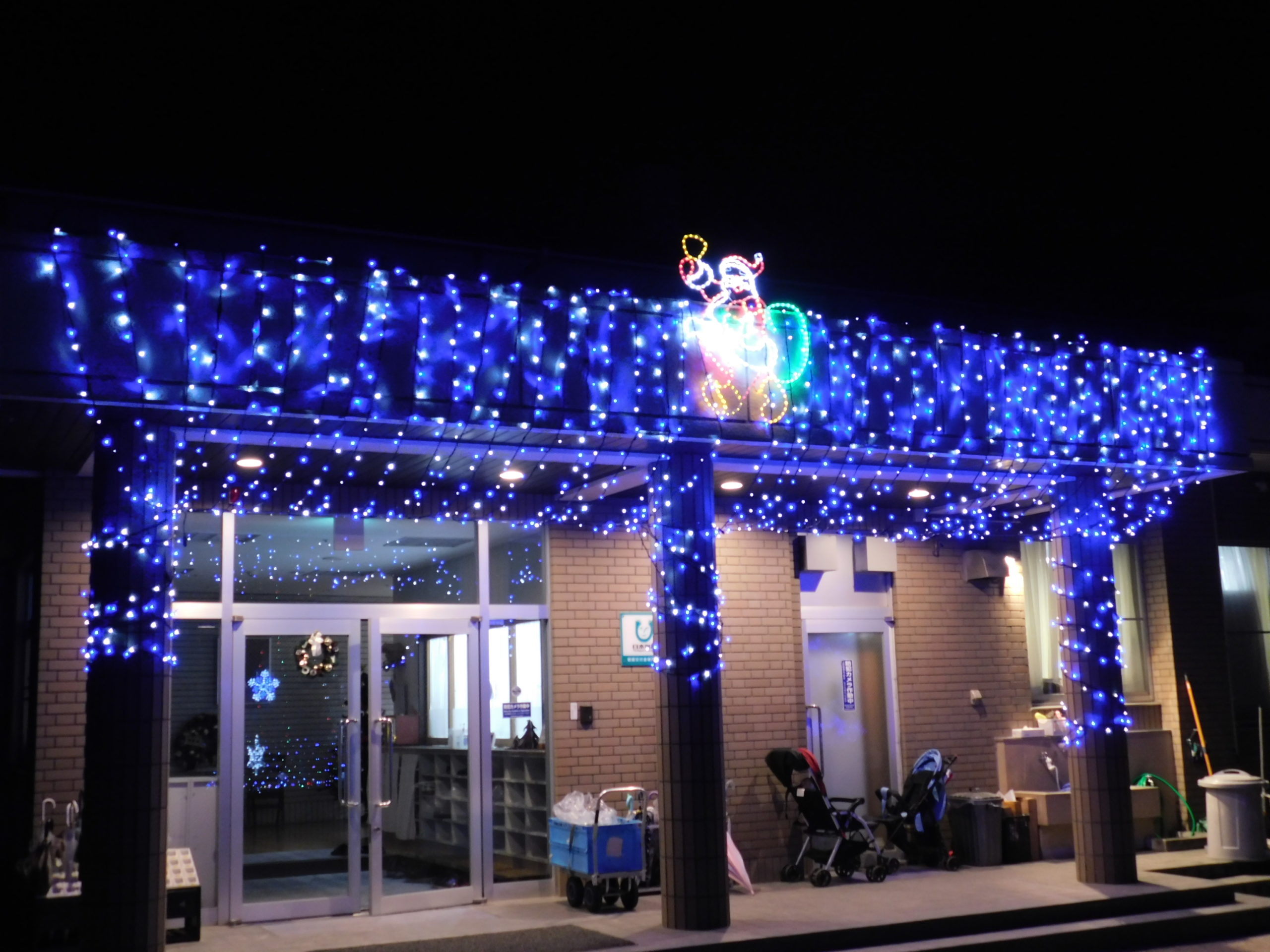 同組合様によるイルミネーションは平成27年から毎年続けていただいており、今年も色とりどりの光で施設を華やかに彩ってくださっています。
