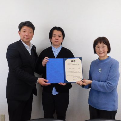 2月10日の贈呈式には株式会社SHIMIZU-HTP代表取締役社長の清水 克泰様、滋賀銀行彦根エリア統轄店長の水口 栄寿様、彦根支店の三橋 奏介様がご来院くださいました。