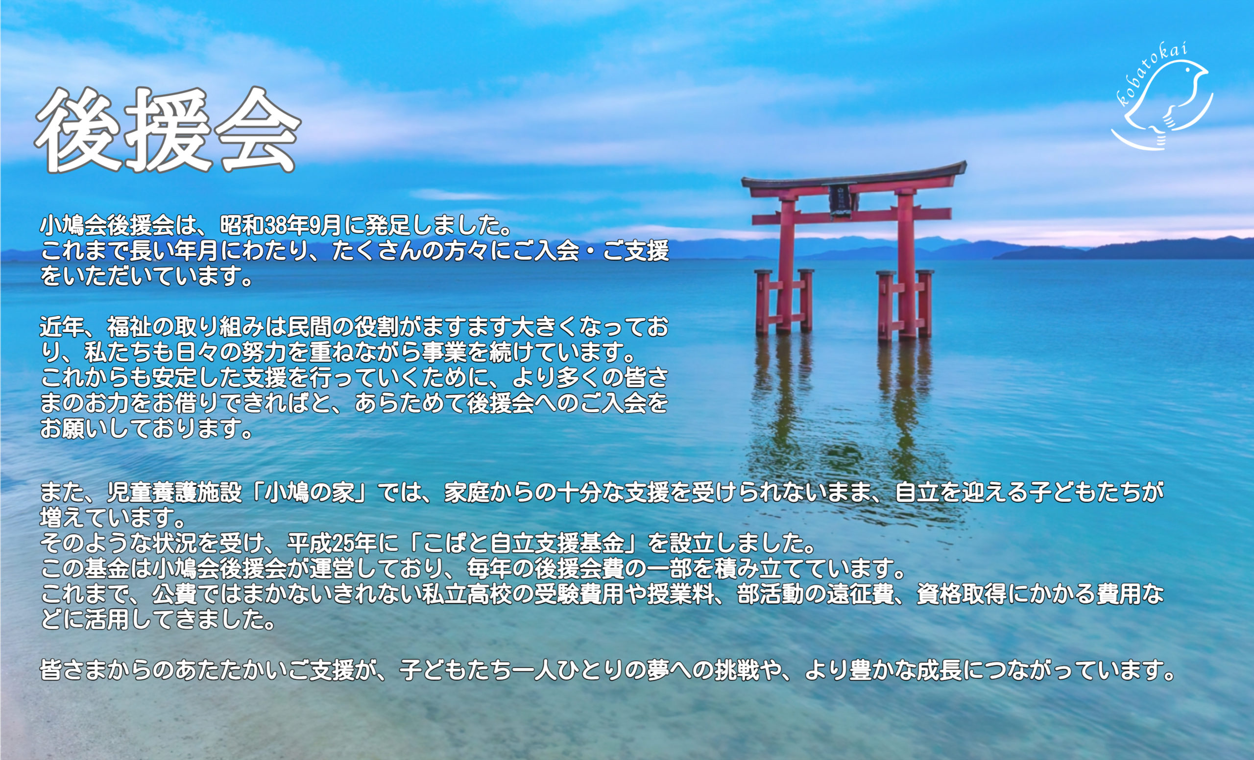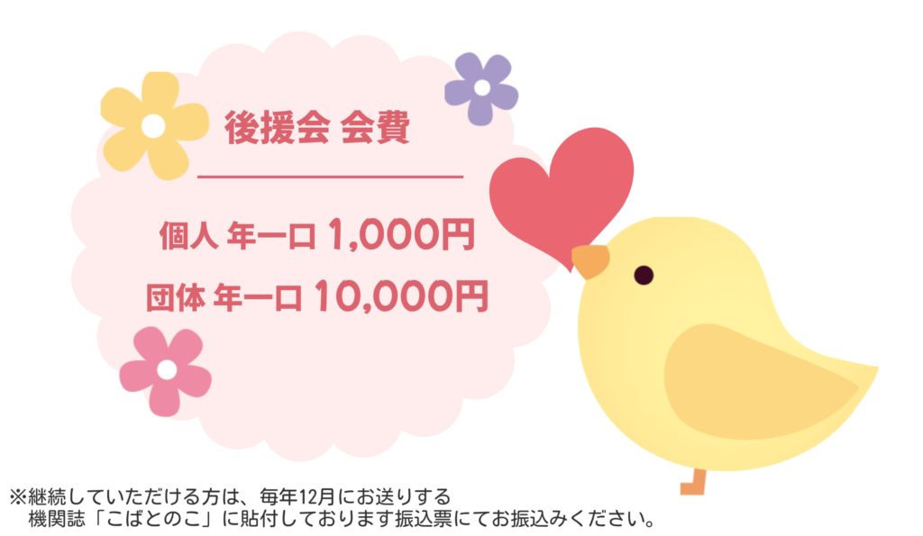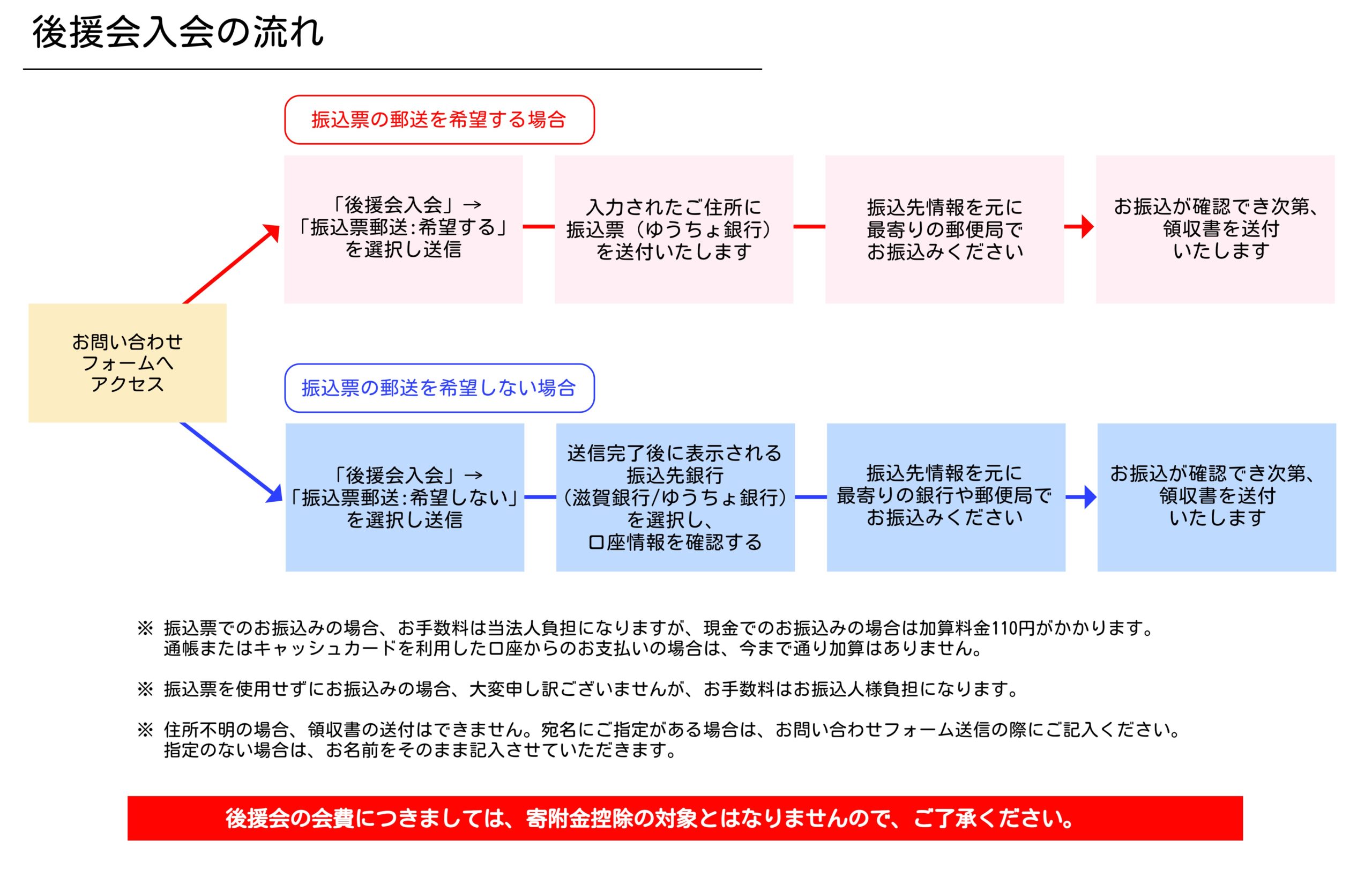 お問い合わせはこちら お問い合わせはこちら 後援会とご寄付(金銭)で迷われたときは 後援会は、年に一度会費をお納めいただく、継続的なご支援のかたちです。会費は1口1,000円(団体様は1口10,000円)で、継続は任意です。 ご寄付は、金額や回数に決まりのないご支援です。寄附金控除の対象となります。ご入金を確認後、領収書を郵送いたします。 物品のご寄贈はこちら